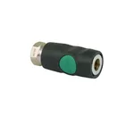 Door op de groene knop te drukken sluit de snelkoppeling de luchttoevoer af, de slang wordt ontlucht en vastgehouden in de snelkoppeling tot hij drukloos is.