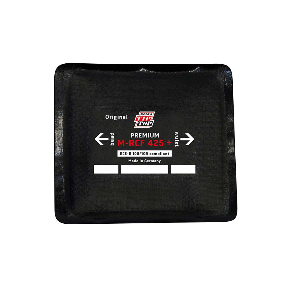 De centreerpleisters van de Rema Tip PREMIUM Line zijn de nieuwe generatie bandreparatiepleisters. De RAD pleister 425+ M-RCF PREMIUM Line biedt een duurzame reparatie aan de wang, schouder en het loopvlak van een radiaal band. De verbeterde rubberen hechtlaag bestaat uit twee rubberen componenten en is daardoor bimodaal. Hierdoor zijn de RAD pleisters PREMIUM Line nog sterker, soepeler en beter hechtend. Bij een juiste toepassing biedt deze pleister een zeer duurzame reparatie. In de middelste laag van de pleister zitten speciale rayon koorden verwerkt. Dit vergroot de kracht van de pleister en blijft tegelijkertijd zeer flexibel. Daarom is deze radiaal pleister geschikt voor zowel personenwagen-, truck-, landbouw- als grondverzet banden. Bij de hechtlaag van deze M-RCF PREMIUM Line pleister is geen solutie nodig maar deze wordt verwarmd voor de vulkanisatie in een opwarmbox (5153260). Door de milieuvriendelijke vulkanisatie is deze pleister zeer geschikt voor een agrarische omgeving. Maak bij het kiezen van de juiste maat pleister gebruik van de schadetabel, deze is te vinden onder het kopje downloads bovenaan de pagina. Alle Rema Tip Top PREMIUM Line centreerpleisters worden geproduceerd volgens de Europese veiligheidsrichtlijnen (ECE-R 108/109).
